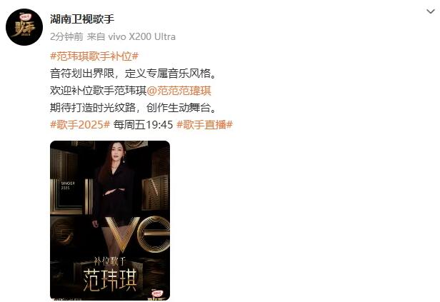 6月5日,湖南卫视歌手发文官宣范玮琪补位。