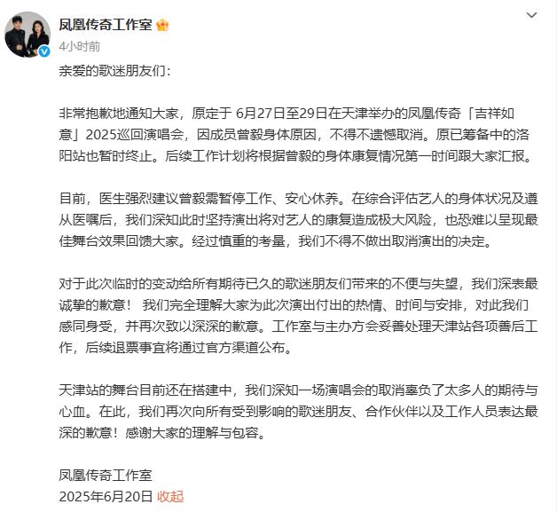 6月20日,@凤凰传奇工作室 发声明称取消演唱会 :因曾毅身体原因,原定于6月27日至29日在天津举办的演唱会取消,筹备中的洛阳站也暂时终止。
